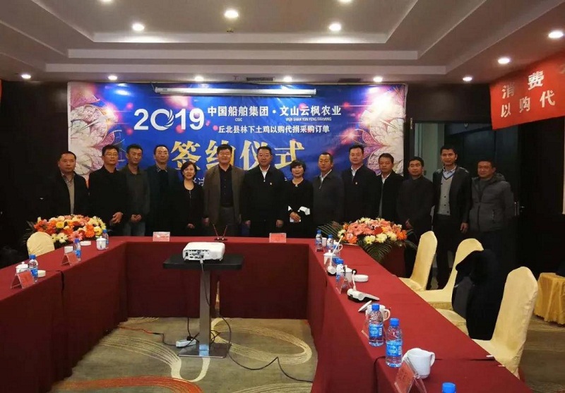 2019年12月22日,中國船舶集團-云南文山云楓農(nóng)業(yè)丘北縣林下養(yǎng)雞“以購代捐”采購訂單簽約儀式在云南丘北縣舉行。