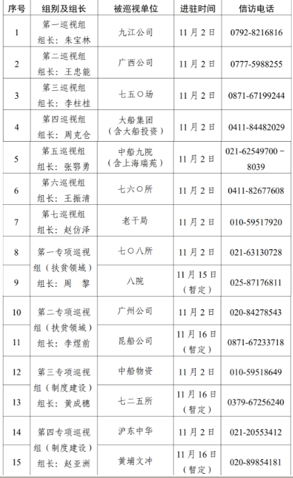 根據(jù)中國船舶集團黨組對2020年第二輪巡視工作的統(tǒng)一部署,截止11月2日,集團公司黨組7個常規(guī)巡視組已全部完成進駐,對九江公司、廣西公司、七五〇場、大船集團(含大船投資)、中船九院(含上海瑞苑)、七六〇所、老干局等7家單位開展常規(guī)巡視。集團公司黨組4個專項巡視組采取“一托二”方式同步對七〇八所、八院、廣州公司、昆船公司、中船物資、七二五所、滬東中華、黃埔文沖等8家單位開展扶貧領(lǐng)域、制度建設(shè)專項巡視,4個專項巡視組目前均已進駐首家被巡視單位。