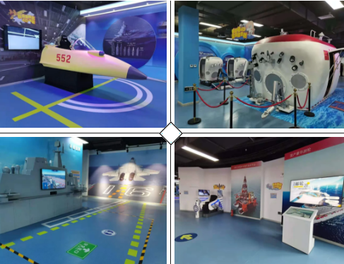 整個(gè)展館內(nèi)分布著護(hù)航體驗(yàn)區(qū)、VR綜合體驗(yàn)區(qū)、航母艦室漫游體驗(yàn)區(qū)、近海VR鉆井平臺(tái)體驗(yàn)區(qū)、艦載機(jī)起飛體感指揮體驗(yàn)區(qū)、航母艦載機(jī)空體驗(yàn)區(qū)等,可以讓參觀者模擬駕駛我國船海重器,親身感受搏浪滄海、護(hù)衛(wèi)海疆的震撼與自豪,使得船舶館成為海洋特色鮮明、模型館藏豐富、互動(dòng)體驗(yàn)感強(qiáng)的軍事科普教育展館和軍事文化娛樂園區(qū)。