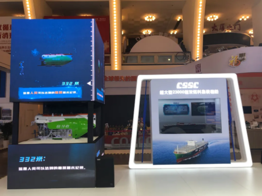 進(jìn)入中國船舶展廳,觀眾不僅能夠看到“奮斗者”號全海深載人潛水器、“雪龍2”號極地科考船等多個(gè)高科技品牌產(chǎn)品,還可以通過航空母艦、常規(guī)動力潛艇、驅(qū)逐艦、護(hù)衛(wèi)艦?zāi)P土私馕覈鴩姥b備實(shí)力。