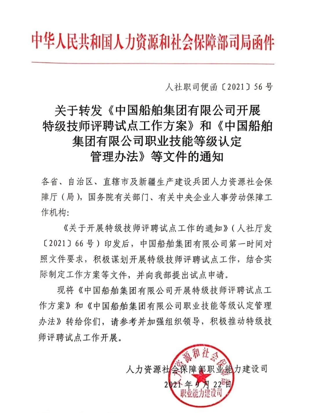 通知發(fā)布后,中國船舶集團第一時間對照文件要求,積極謀劃開展特級技師評聘試點工作,集團公司黨組審議出臺《職業(yè)技能等級認定管理辦法》,進一步明確以“特級技師”為塔尖的六個技能等級,第一時間制定特級評聘工作方案,積極向人社部申報特級技師評聘試點。同時部署了2021年特級技師評審工作,今年計劃增加80名左右特級技師。