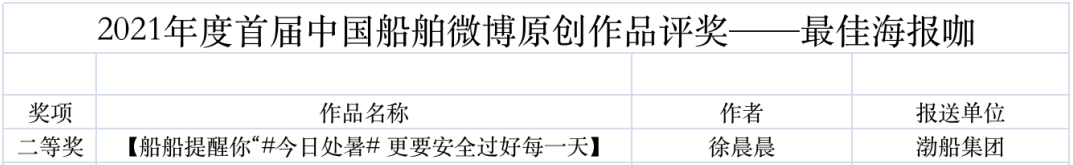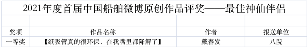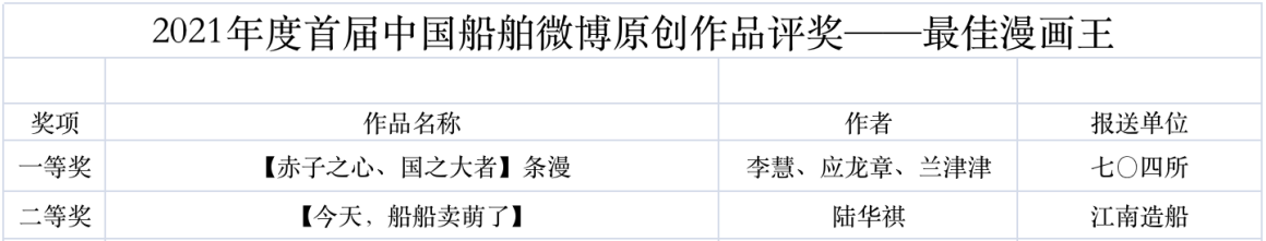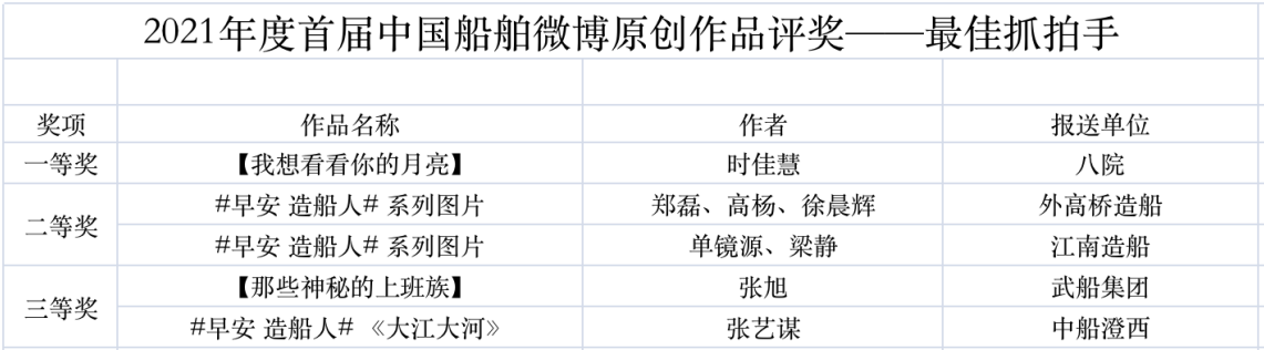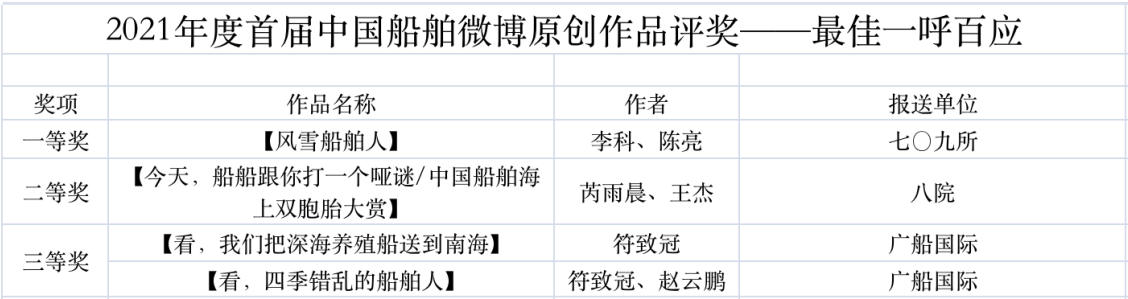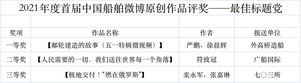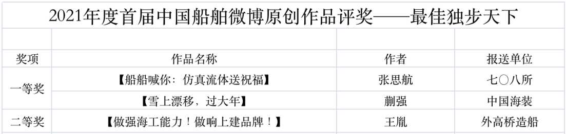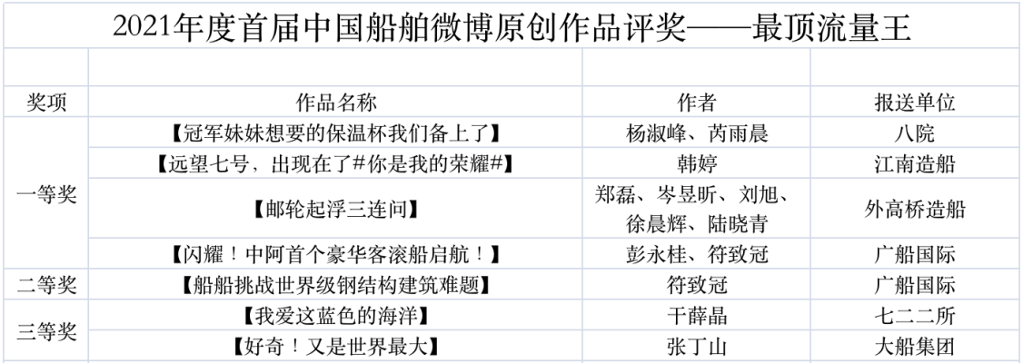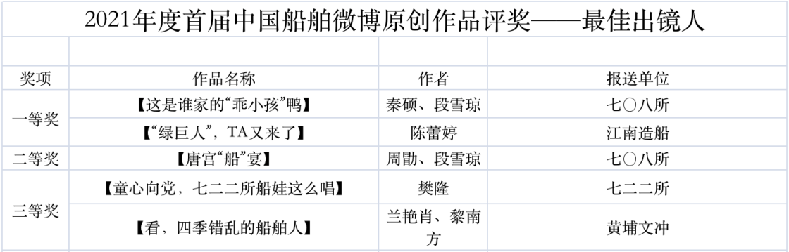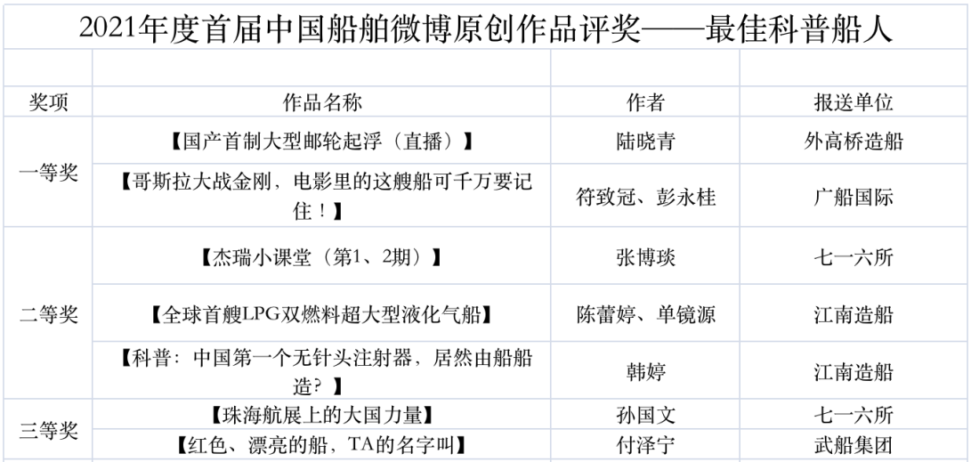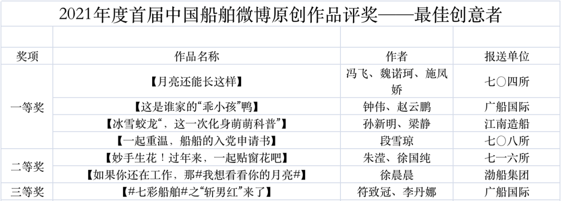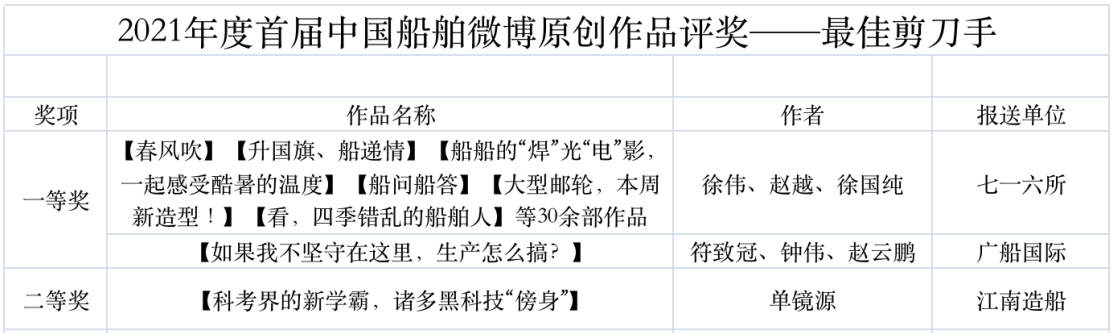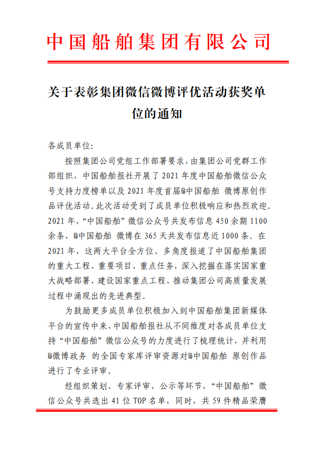 為鼓勵更多成員單位積極加入到中國船舶集團(tuán)新媒體平臺的宣傳中來,在集團(tuán)公司黨群工作部的指導(dǎo)下,中國船舶報社從不同維度,對2021年度各單位支持“中國船舶”微信的力度進(jìn)行了梳理統(tǒng)計,并利用微博政務(wù)的全國專家?guī)煸u審資源,對2021年度“中國船舶”微博原創(chuàng)作品進(jìn)行了專業(yè)評審,評選結(jié)果公布如下: