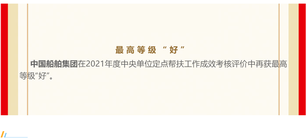 近日,中國船舶集團(tuán)在2021年度中央單位定點(diǎn)幫扶工作成效考核評價(jià)中再獲最高等級“好”。這是自2019年組建成立以來,中國船舶集團(tuán)連續(xù)第三年獲“好”。