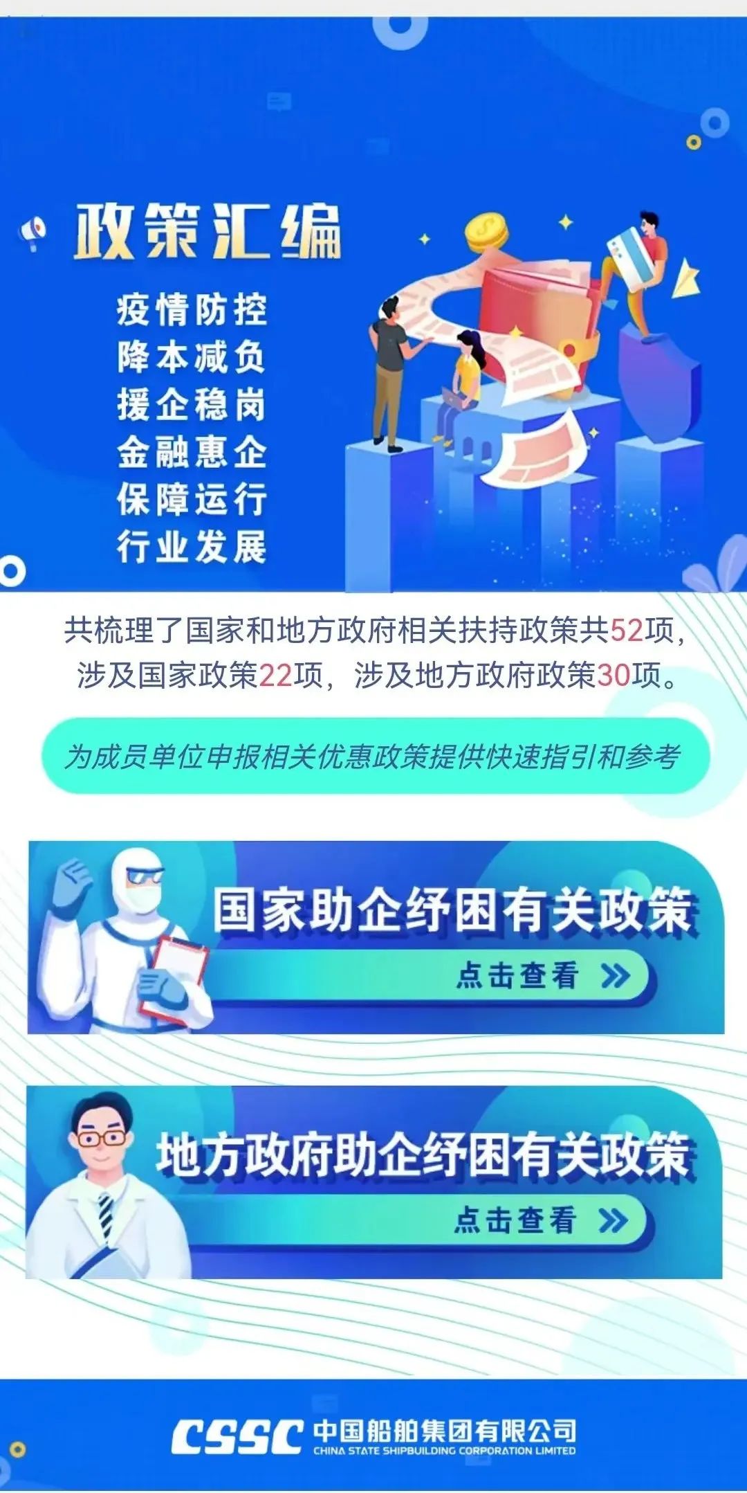 今年新冠疫情發(fā)生以來,為支持企業(yè)應(yīng)對(duì)疫情防控、加快復(fù)工達(dá)產(chǎn),國(guó)務(wù)院、相關(guān)部門、相關(guān)地方政府出臺(tái)了一系列助企紓困政策。集團(tuán)公司對(duì)這些政策進(jìn)行了梳理,共涉及相關(guān)支持政策52項(xiàng)(其中,國(guó)家支持政策22項(xiàng)地方支持政策30項(xiàng)),供成員單位查閱參考。