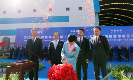 9月24日,中國船舶集團旗下大船集團聯(lián)合中船貿(mào)易為招商局集團旗下招商輪船建造的30萬噸VLCC “新伊敦”輪正式命名交付。同日,大船集團聯(lián)合中船貿(mào)易成功承接了招商輪船2艘17.5萬立方米大型LNG運輸船新造項目。中國船舶集團黨組副書記、總經(jīng)理楊金成,黨組成員、副總經(jīng)理孫偉,招商局集團黨委書記、董事長繆建民,黨委副書記、總經(jīng)理胡建華,紀委書記、董事段湘暉,黨委委員、副總經(jīng)理李百安出席儀式??娊駷樾麓瑮罱鸪?、胡建華在儀式上致辭,段湘暉為新船砍纜。