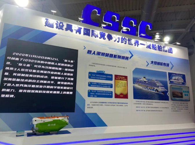 在重大科技專項工程展區(qū),中國船舶集團集中展示了在深??茖W研究和海洋資源開發(fā)領域深化實施的“蛟龍”號、“深海勇士”號、“奮斗者”號三型載人深潛裝備等一批重大科技專項工程,以及取得的突破性、標志性的成果。其中,展會現(xiàn)場展示的“奮斗者”號創(chuàng)造了10909米的中國載人深潛深度紀錄。