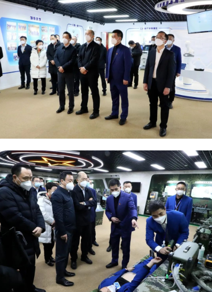 譚作鈞一行參觀了中國船舶集團旗下中船海神醫(yī)療科技有限公司應急醫(yī)療救援裝備展廳,觀摩了公司自主研制的便攜式通用生命支持系統(tǒng)模擬急救現(xiàn)場演示,詳細了解了有關產(chǎn)品的技術研發(fā)、性能指標、應用場景和生產(chǎn)保供能力等情況。