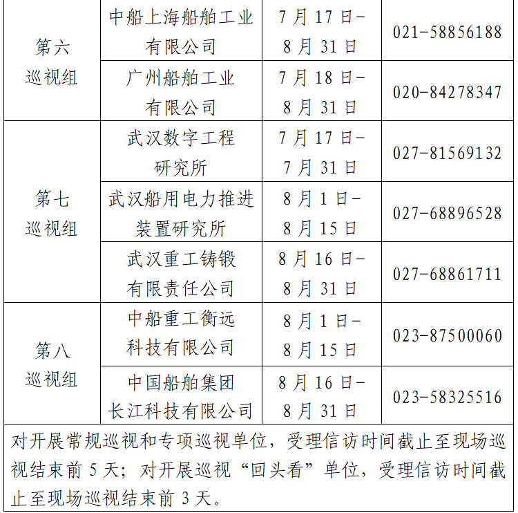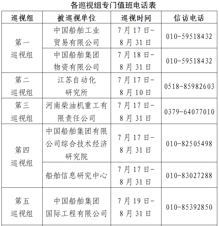 根據(jù)中國船舶集團(tuán)黨組2023年第一輪巡視工作部署,截至2023年7月17日,巡視工作已經(jīng)鋪開。其中,對中國船舶工業(yè)貿(mào)易有限公司、中國船舶集團(tuán)物資有限公司、江蘇自動化研究所、河南柴油機重工有限責(zé)任公司、中國船舶集團(tuán)有限公司綜合技術(shù)經(jīng)濟(jì)研究院、船舶信息研究中心、中國船舶集團(tuán)國際工程有限公司等7家單位開展常規(guī)巡視,對中船上海船舶工業(yè)有限公司、廣州船舶工業(yè)有限公司等2家單位開展專項巡視,對武漢數(shù)字工程研究所、武漢船用電力推進(jìn)裝置研究所、武漢重工鑄鍛有限責(zé)任公司、中國船舶集團(tuán)長江科技有限公司、中船重工衡遠(yuǎn)科技有限公司等5家單位開展巡視“回頭看”。