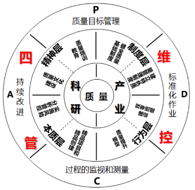 七二五所結(jié)合自身軍工科研和科技產(chǎn)業(yè)“一所兩制”的特點,凝練形成了一套目標(biāo)明確(P)、標(biāo)準(zhǔn)作業(yè)(D)、監(jiān)管有效(C)、螺旋上升持續(xù)改進(jìn)(A)的“四維”質(zhì)量管理模式。該模式沿著精神層、制度層、行為層和本質(zhì)層四個維度實施質(zhì)量建設(shè)和管控。精神層是“核心”層,體現(xiàn)了七二五所人對質(zhì)量價值的精神追求,通過質(zhì)量文化創(chuàng)建、內(nèi)外部宣傳教育來牢固樹立四維質(zhì)量管理的理念。制度層是“法制”層,以制度形式規(guī)范質(zhì)量行為、工藝標(biāo)準(zhǔn)。建立覆蓋四大板塊的多行業(yè)立體式管理體系,形成47個特色制度,保障四維質(zhì)量管理模式的有效實施。行為層是“實施”層,通過質(zhì)量提升模型和雙零班組建設(shè)開展實施,反映了七二五所人對質(zhì)量文化精神維度的理解和對制度維度的遵守。本質(zhì)層是“目的”層,是四維質(zhì)量管理輸出的目標(biāo)產(chǎn)物,反映了產(chǎn)品、服務(wù)的本質(zhì)質(zhì)量。