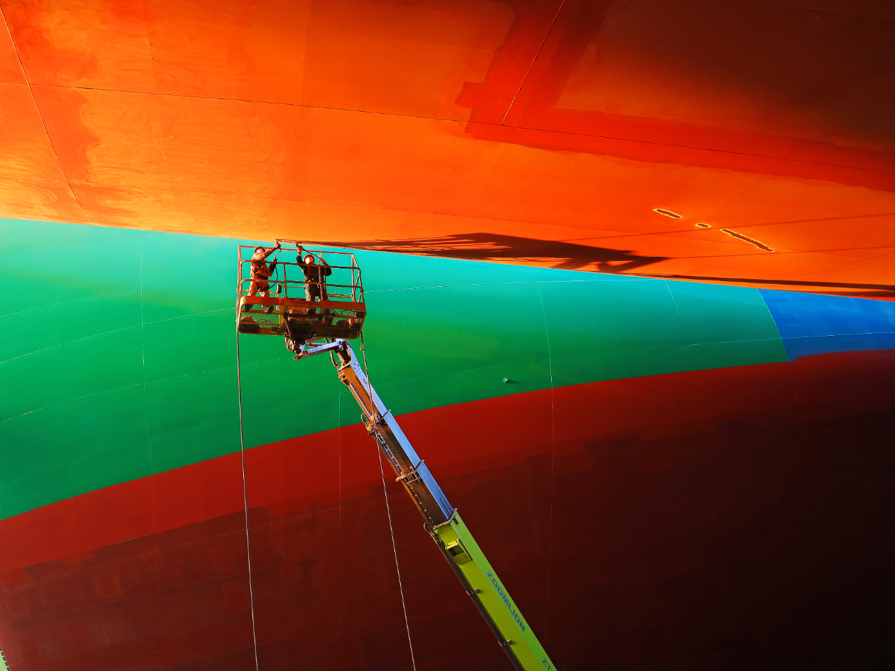 兩位打磨工人駕駛高空車對外板進(jìn)行清潔施工,這個瞬間,他們?nèi)缤蒙碛谕挳?dāng)于一般。