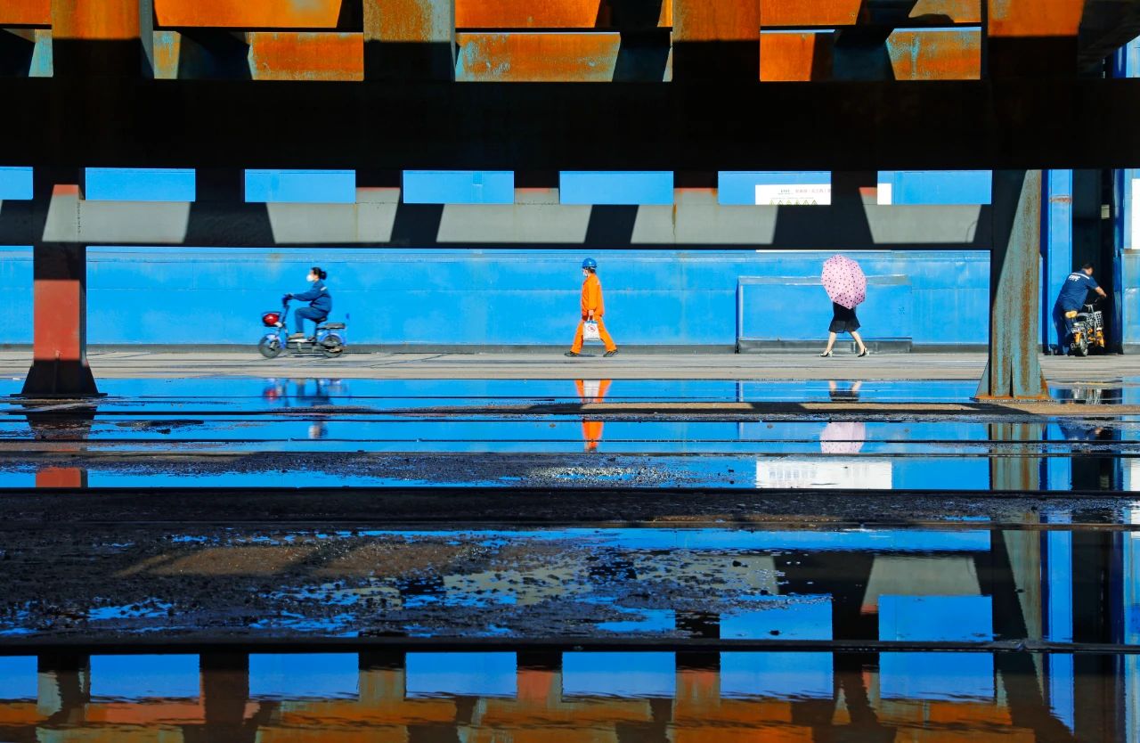 夏日清晨,一場大雨過后空氣透亮清新,廠區(qū)高跨門口服裝各異的職工行走在上班的路上,空地上擺放的工裝架與其自身的投影形成了獨(dú)特的畫框,讓畫面中行走的職工雖小卻很突出,起重工亮橙色的服裝、撐起的雨傘與明亮的藍(lán)色跨門形成色彩對比,使畫面活潑跳躍,職工們形形色色又從容有序,勾勒出廠區(qū)一隅的美麗風(fēng)景。