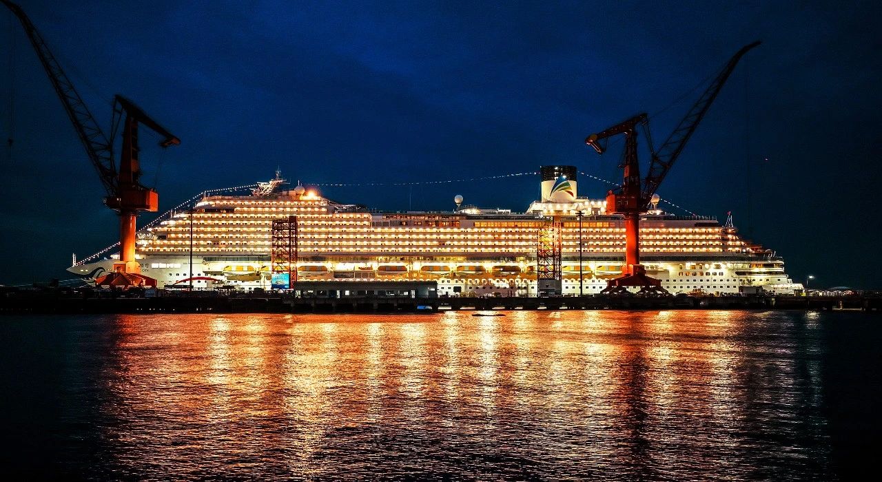 國產(chǎn)首艘國產(chǎn)大型郵輪“愛達(dá)·魔都號”,??吭陂L江口,燈光電路測試期間,華燈綻放恍如白晝。
