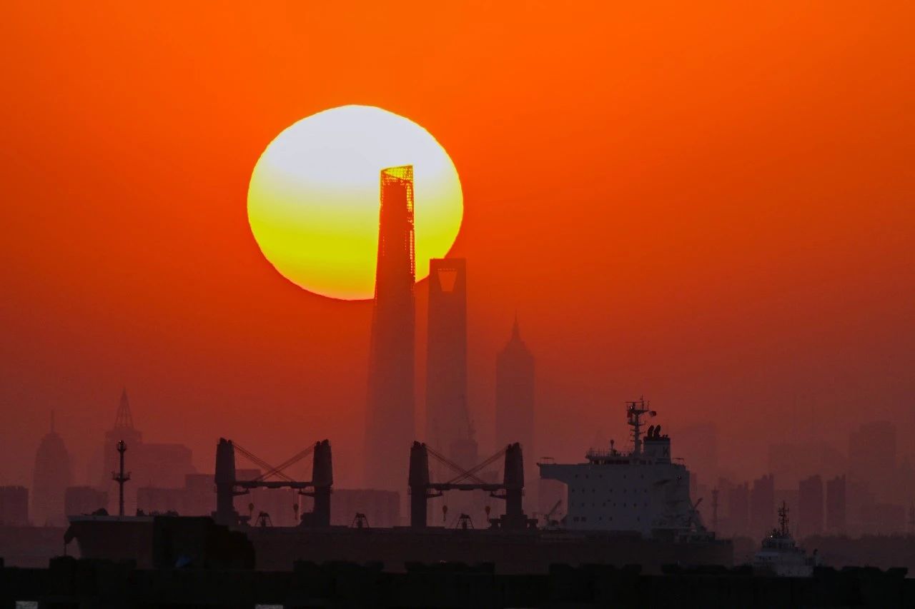 從距離陸家嘴33公里遠(yuǎn)的橫沙島上遠(yuǎn)眺“三件套”,夕陽從“三件套”穿過,此時一艘船駛?cè)氘嬅?,與夕陽形成近中遠(yuǎn)三景。