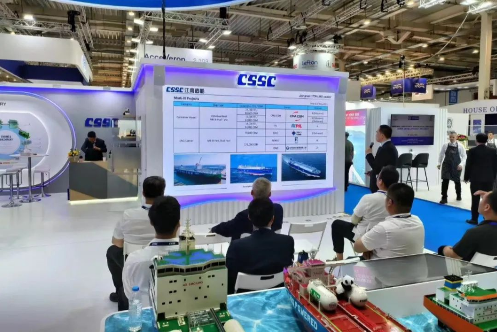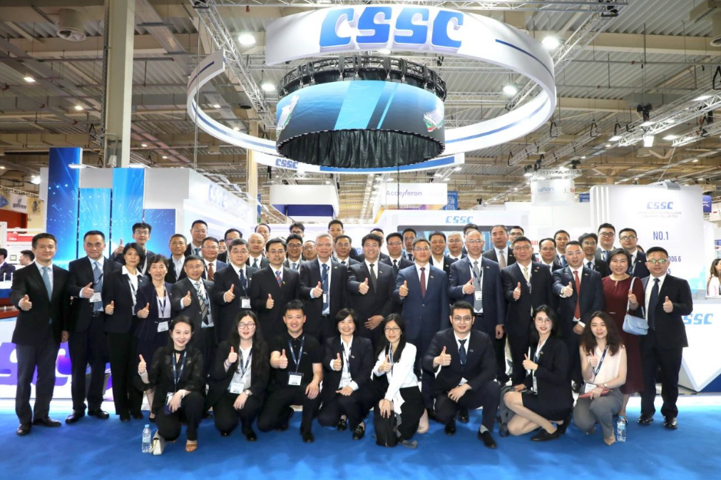 此次展會,中國船舶集團(tuán)攜旗下19家成員單位參展,有關(guān)成員單位負(fù)責(zé)人率隊赴展會開展重點船海項目經(jīng)營洽談并拜訪當(dāng)?shù)睾椭苓厙铱蛻?。集團(tuán)公司以“共贏未來”為參展主題,設(shè)置集團(tuán)總體區(qū)、綠色航運解決方案區(qū)、低碳環(huán)保配套設(shè)備區(qū)共3個展示區(qū)域,重點展示了135500總噸大型郵輪、175000方LNG運輸船、24000箱超大型集裝箱船、210000噸氨燃料散貨船、LNG雙燃料VLCC等一系列高技術(shù)、高附加值明星產(chǎn)品,以及CPGC-WinGD 10X92DF-M甲醇雙燃料發(fā)動機(jī)、船用碳捕捉系統(tǒng)等全球船東高度關(guān)注的綠色低碳配套設(shè)備。同時,通過展臺上醒目的品牌標(biāo)識、層級化的品牌體系圖、富有感染力的品牌推介視頻,首次面向全球客戶,立體化展示“中國船舶”品牌及下屬企業(yè)品牌和產(chǎn)品品牌體系,進(jìn)一步強(qiáng)化了集團(tuán)公司品牌形象。