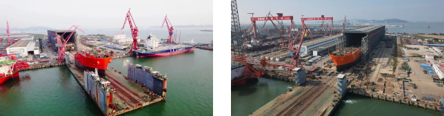 巨型總段“乘坐”移船小車和模塊小車登上浮船塢,奔赴室內(nèi)船臺,完成主船體大合攏。