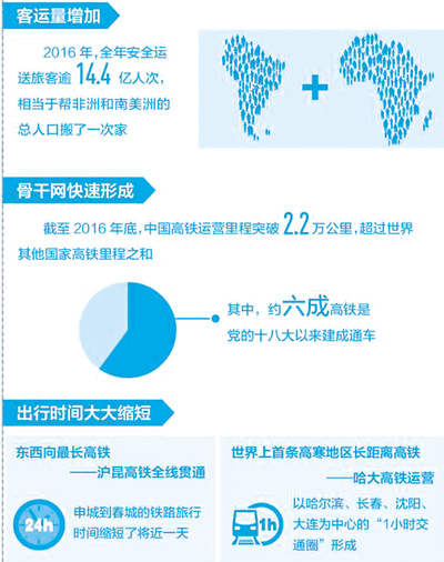 編織一張密度適宜的高鐵網(wǎng)絡(luò),造福盡可能多的民眾。十八大以來,我國高鐵版圖不斷延伸:2013年7月,穿越江南水鄉(xiāng)的寧杭高鐵開通;2014年6月,世界上一次性建成通車?yán)锍套铋L的高速鐵路蘭新高鐵建成通車;2016年12月,滬昆高鐵全線通車,彩云之南不再“邊緣”。截至2016年底,中國高鐵運(yùn)營里程突破2.2萬公里,超過世界其他國家高鐵里程之和,除幾條線路外,2004年提出的“四縱四橫”高鐵網(wǎng)已全部建成。根據(jù)2016年7月新修訂的國家《中長期鐵路網(wǎng)規(guī)劃》(2016-2030年),預(yù)計(jì)到2020年,全國高速鐵路將增加到3萬公里。今年繼續(xù)保持高鐵網(wǎng)絡(luò)快速建設(shè)勢(shì)頭,就在上月初,寶蘭高鐵通車,將使千年絲路煥發(fā)更加蓬勃的生機(jī)。不久后,我們還將見證張呼客專馳騁于遼闊的大草原,而西成高鐵也將讓千年蜀道不再艱難。